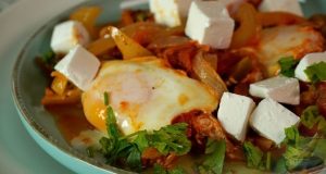 Шакшука с болгарским перцем, фетой и оливками — это настоящий завтрак в средиземноморском стиле. Сначала овощи обжариваются, затем тушатся с сочными помидорами, ароматными специями и пряностями. Уже в насыщенном соусе готовятся яйца. Перед подачей блюдо украшается нежной фетой и свежей зеленью. Продукты Яйца куриные – 6 шт. Лук репчатый – 120 г Перец болгарский (оранжевый и жёлтый) – 280 г ...