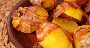 Простое и эффектное блюдо – картофель с вялеными томатами внутри и запеченный в беконе. Отличная закуска или оригинальный гарнир к любому блюду. Порционное приготовление в фольге делает этот процесс особенно удобным. Продукты Картофель – 650 г (7 шт.) Бекон копчёный полосками – 120 г Томаты вяленые в масле – 90 г Чеснок сушёный – по вкусу Соль – по вкусу ...