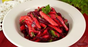 1 час 20 мин (ваши 20 мин) Свекольный салат с яблоком и хреном – яркий и пряный гарнир или закуска. Варёная свёкла отлично сочетается с кисло-сладким яблоком и остротой хрена. Ароматная заправка с яблочным уксусом и зелень придают блюду насыщенность и особенный вкус. Продукты Свёкла – 380 г Яблоко – 280 г Хрен столовый – 20 г Уксус яблочный – ...