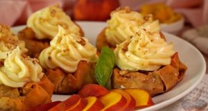 Сарагли с заварным кремом и персиками — это нежный греческий десерт из хрустящего теста фило, наполненный воздушным кремом и сочными фруктами. Из персиков готовится нежное пряное варенье кусочками. Десерт выглядит эффектно, но готовится проще, чем кажется. Продукты Орехи грецкие – 400 г Корица молотая – 1 ч. ложка Тесто фило – 400 г Масло сливочное (для смазывания теста) – 200 ...