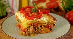 Мусака из картофеля это сытное и вкусное блюдо, которое популярно в румынской и балканской кухнях. Оно представляет собой запеканку из слоев картофеля, мясного фарша и заливки, на основе яиц, сметаны и тёртого сыра. И картофель, и фарш предварительно обжариваются. Продукты Говядина – 650 г Картофель – 1 кг Помидоры – 250 г Перец болгарский – 200 г Лук репчатый – ...