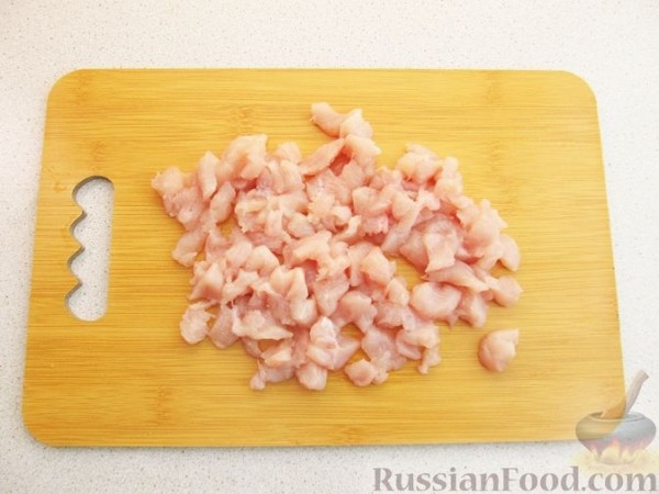 Репчатый лук очищаем и половину репчатого лука нарезаем кубиками.