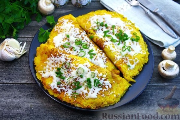 Продукты Картофель – 700 г Куриное филе – 150 г Сыр моцарелла – 150 г Шампиньоны – 200 г Сливки 20% – 100 мл Лук репчатый – 130 г Морковь – 120 г Чеснок – 2 зубчика Яйцо – 1 шт. Мука – 50 г Сушеный чеснок – 1 ч. л. Карри – 0,5 ч. л. Сливочное масло – 30 г Зеленый лук – 20 г Масло растительное – 60-80 мл Соль – по вкусу Перец черный молотый – по вкусу