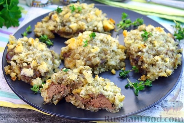 Ставим в предварительно разогретую до 180 градусов духовку на 20 минут. После этого фольгу снимаем и запекаем печень еще 10 минут, чтобы хлебная “шубка” подрумянилась.