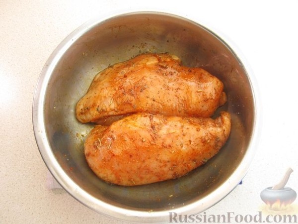 Куриное филе моем, обсушиваем и кладем в емкость.
