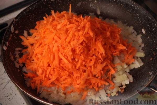 К жареному луку добавляем морковь, жарим, помешивая, около 10 минут.