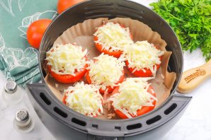Быстро, просто и очень вкусно — это запеченные помидоры с сыром в аэрогриле. Если вы любите сочную закуску, то семена не удаляйте из томатов. А если хотите более мягкие томаты и расплавленный сыр, то сначала запеките томаты, а потом уже добавьте в них сыр и дотомите еще 2-3 минуты.