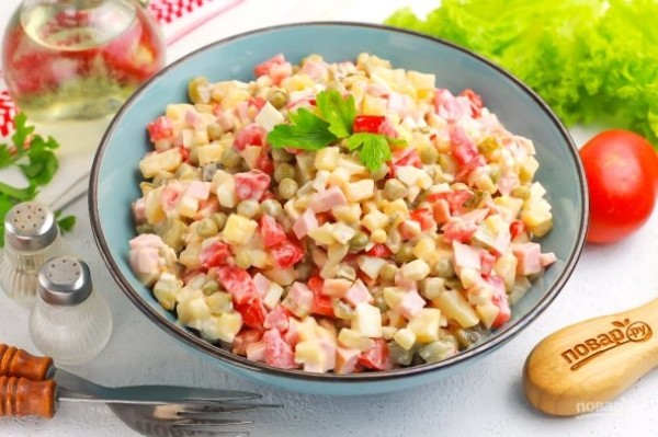 Полейте салат заправкой. Посолите и поперчите по вкусу.