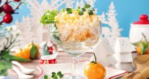 Мандарины очистите от кожуры и удалите все белые волокна. Отделите дольки одну от другой и нарежьте на части, попутно удаляя семечки. Очень тщательно просмотрите, чтобы семена не попались. Добавьте нарезку в емкость.