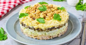 Салат наверняка понравится рыбным гурманам, ведь в его составе есть консервированный тунец. По желанию для большей сытости блюда можно добавить отварной рис, но уже в остывшем виде. В таком случае салат можно приготовить заранее — рис впитает в себя огуречный сок.