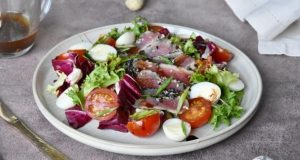 Консервированные ананасы можно покупать как в кольцах, так и нарезанные кусочками — все равно вы их потом нарежете более мелкими кубиками. В качестве свежей зелени можно использовать на ваш вкус — петрушку, укроп или свежий базилик. Творожный сыр выбирайте тот, который используется для салатов — он продается в форме брикета.