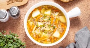Посолите и поперчите, добавьте лавровый лист. Доведите до кипения и варите суп вместе 5 минут. После накройте крышкой, выключите плиту и дайте супу настояться еще полчаса.