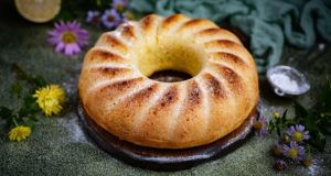 Испеките примерно 25-30 минут до сухой шпажки, выходящей из середины бисквита. Извлеките форму из духовки и переверните на бок, чтобы выпечка остыла.
