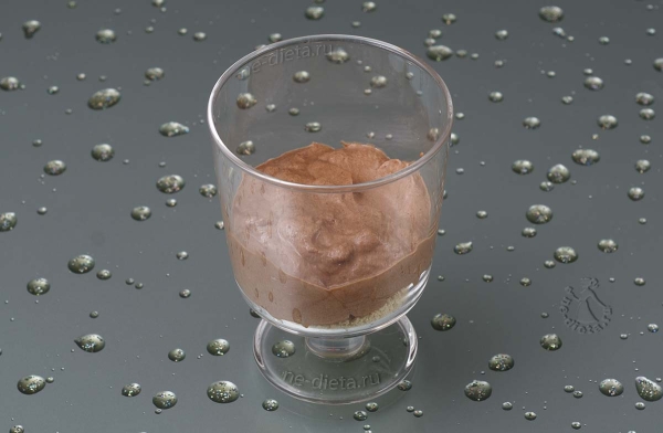 7. Теперь начнем собирать десерты в креманках, стаканах или красивых бокалах. Для этого на дно каждой порционной посуды выложить по 2 ч. л. измельченного печенья и сверху аккуратно наслоить 2 – 3 ст. л. шоколадного мусса.