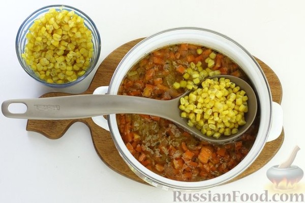 Добавьте консервированную кукурузу. Доведите до кипения и варите 4-5 минут.
