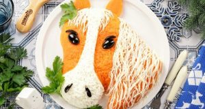 Натрите твердый сыр на средней терке и выложите внутрь кольца на морковь, утрамбуйте и смажьте майонезом.