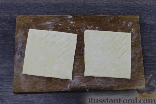 Слоёное тесто выложите на присыпанную мукой поверхность. Разрежьте тесто на квадраты со стороной 11 см.