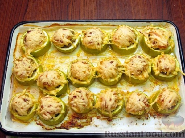 В сезон кабачков приготовьте новое блюдо. Нафаршируйте колечки кабачков начинкой из фарша индейки (или любого мясного), моркови, лука и зелени, смажьте майонезом, посыпьте сыром и отправьте в духовку. Через время получите замечательный результат: сочные кабачки, внутри – ароматная начинка, а сверху – аппетитная сырная корочка. Попробуйте!